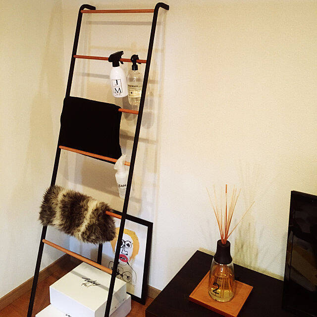 アクタスのラダーラックをお使いのmomo3さん。ブラックの支柱と天然木のバーの組み合わせが、モダンな雰囲気のお部屋に調和していますね。おしゃれなディスプレイのようでいて、しっかり垂直スペースを活用した収納としても機能しています。