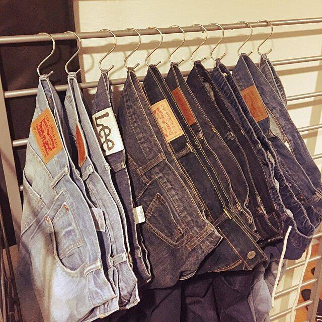 デニムの収納は、かさばる……という悩みがつきもの。そんな悩みはS字フックが解決してくれます。ユーザーさんの実例のように、ベルト通しにフックをかけて吊るして収納すると、省スペースなうえショップのような雰囲気に。どうせならかっこよく収納したい!という要望にも、しっかり応えてくれるアイデアですよね。