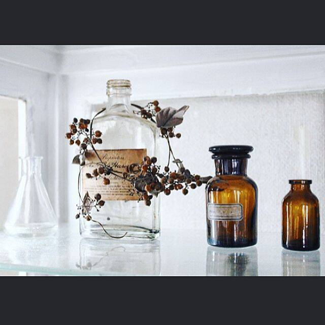 瓶をアンティーク雑貨の一部として扱っている実例です。ビーカーやフラスコ、工具などを取り入れることで、ちょっぴり男前×理系の雰囲気もプラス。ドライフラワーのレトロな風合いや木製棚などが、さらにアンティーク感を高めてくれています。