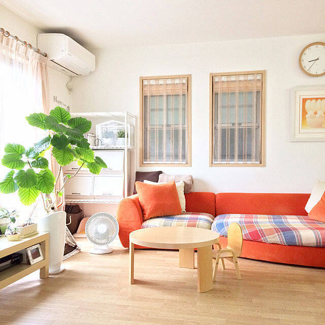 miyuさんのリビングは、床と丸テーブル、テレビ台が明るい白木で統一され、白い壁とともに北欧スタイルのインテリアを作っています。そんな落ち着きのある空間にポップなイメージをプラスしているのが、オレンジ色のソファ。座面にいろいろな色を使ったチェック柄のファブリックを選んでいるところも、ポイントです。