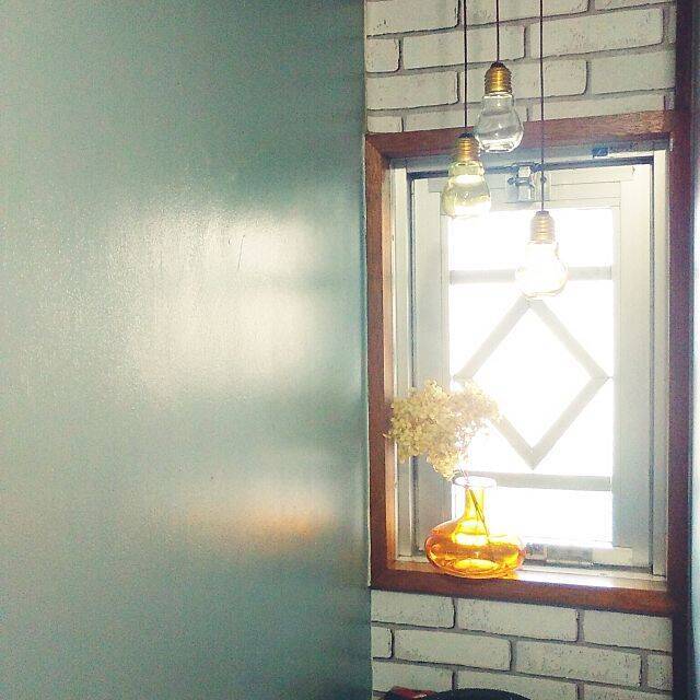 syungikuさんは、電球型ボトルに革紐を通して、吊り下げています。ノスタルジックな雰囲気が漂うインテリアとの相性も抜群ですね。まるで、町家を改造したカフェのようです。
