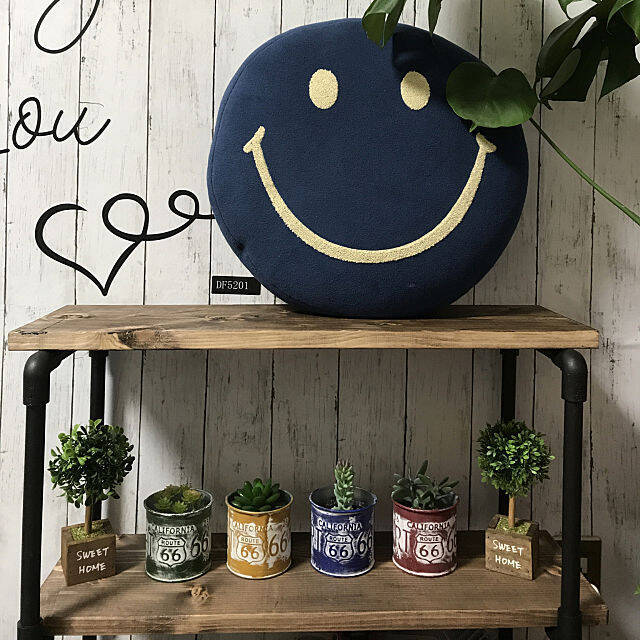 Hanmiさんは、塩ビパイプの棚にチャレンジ!塩ビパイプにはアイアンペイントブラックを、木板にはアンティークワックス ウォルナットを使用しています。ペイントウッドの白い壁紙や雑貨、スマイルクッションなど、カラートーンが統一され渋可愛いです♡