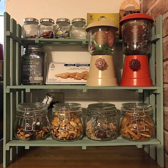 すのこをバターミルクペイントで塗装した、maisonさんのお菓子棚です。リビングカウンターの片隅に置かれています。手作りのキャンディポットや、ガラスキャニスターで見た目もオシャレ♡中身が見えるので、食べたいお菓子を少しずつ取り分けられますね。