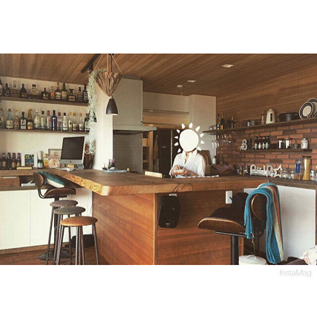 おしゃれなバーの雰囲気を楽しみたいなら、mihoさんのライトの使い方はきっと参考になるはず。ペンダントライトの多灯使いで昼間はカフェの雰囲気を楽しみ、BARのサインが灯ったら大人の時間♪どちらのライトも、カウンターエリアの雰囲気にぴったりなものを選んでいるのがポイントです。