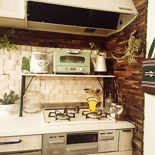 ちょっぴりレトロなキッチン用品が、センスよくディスプレイされているkajyuさんのキッチン。石のタイルを正面に、古材タイルを側面に貼っています。天然石をカットしたタイルは、ひとつひとつの色調も凸凹も違います。がんばって貼ったストーン&ウッドの黄金コンビが織りなす装いは、最高にオシャレです♡