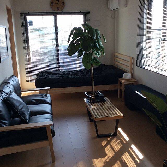 続いては、並行型のレイアウト。mirさんのお部屋には、ご覧のように掃き出し窓があるので、家具を壁に沿って平行に配置することで外からの光が十分に入ります。この形も、お部屋の中央が開くので「抜け」ができます。mirさんのように、大きなウンベラータをはじめ、たくさんのグリーンを飾ってもすてきです。