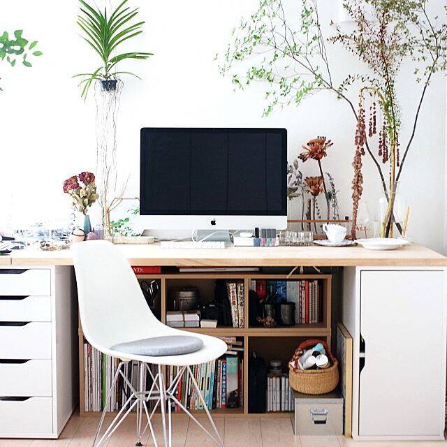 こちらは横置きにして、机下のスペースを有効に活用したとてもスマートな実例です。二台の引き出しに板を渡して制作されたシンプルな仕様の机ですが、中にパルプボードボックスを配置することで、収納力抜群の机に大変身しました。Katsuraさんの工夫が詰まったアイデアですね。