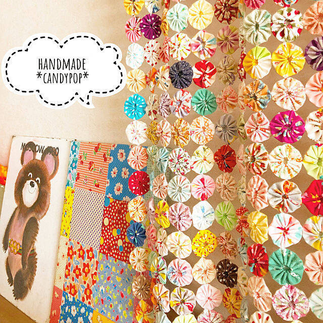 ヨーヨーキルトを使った作品で定番なのが、さまざまな色や模様の生地を使った、彩り豊かなものです。お部屋にカラフルなものがあると、楽しい気分になりますよね。ヴィヴィッドな色合いのもの、彩度をおさえたものなど、取り入れたいのはどのようなカーテンかを想像しながら、ご紹介する実例を参考にしてみてください。