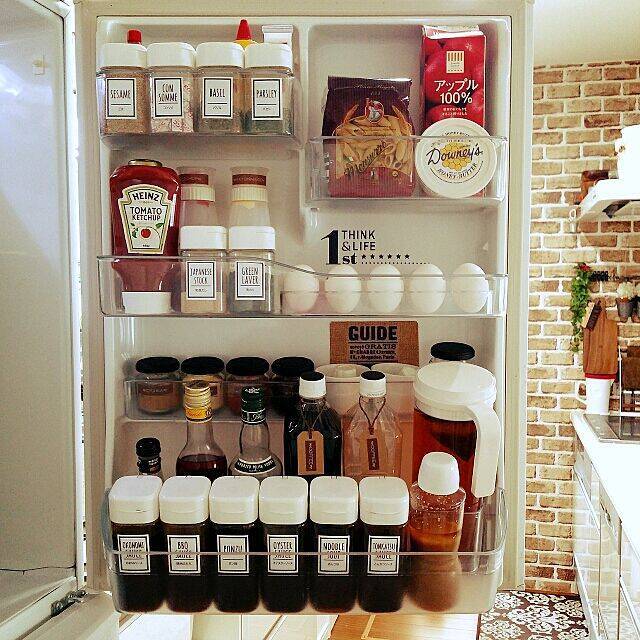 整然と並んだドレッシングボトルに保存されているのは、さまざまな調味料類です。大きなボトルには液状の調味料、小さなものにはスパイスと、サイズで使い分けをされています。ケースが同じでも、分かりやすいラベルのおかげで、迷うことなく必要なものが手に取れますね。