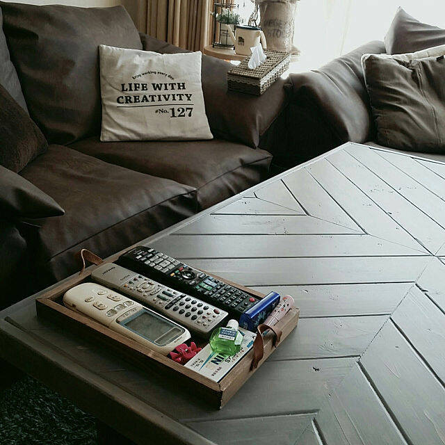 こちらのユーザーさんはリモコン収納にカフェトレイを活用しています。散らばったままにしがちなリモコンや小物をまとめて置くことで、机の上がすっきりと整って見えますね。トレイごと持ち運べると片付けやすくなって、お掃除の時短にもつながりそうです。