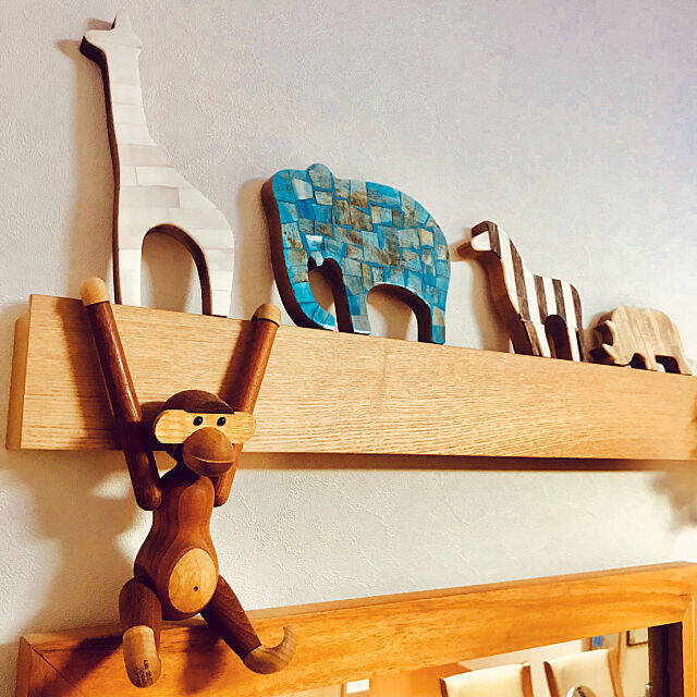 カイ・ボイスンの木製オモチャ・モンキーを先頭に、動物さんのオブジェが行進しているみたいに、ディスプレイされています。こちらの長押は88cmタイプ。オークのナチュラルな色合いは、北欧インテリアにとっても似合います。リビングがほっこり♡くつろげる、スペースになっています。