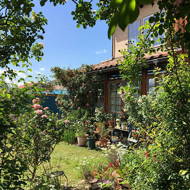 明るい陽射しがたっぷりとそそぎ込むshigimiさんのガーデン。そこにはガーデナーの理想の空間が広がっています。目に入るのは、愛らしい淡い色彩のバラや花の咲き誇る花壇、そしてたくさんの植木鉢にいきいきと育つ植物たち。眩しい緑が心を落ち着かせてくれる、喜びがいっぱいのガーデンです。