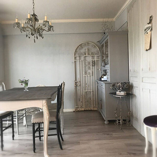 どこかのお屋敷の一角かと錯覚してしまいそうな、完成度抜群のグレーインテリア。趣のあるアンティークな家具が、フレンチシャビーを盛り上げています。曲線の美しいチェアやテーブルに、センスがあふれますね!