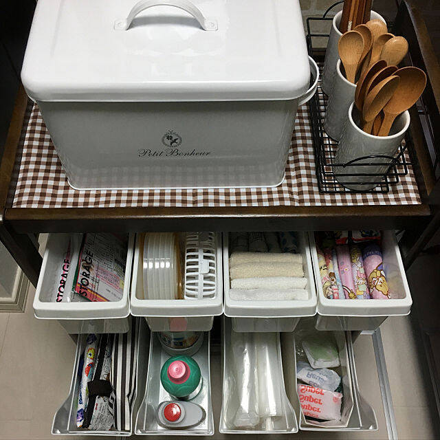 よく使うモノをニトリのキッチンワゴンに収納されているanko.hibuさん。100均のボックスを活用して、きっちりと仕分けをされています。家事の動線もバッチリですね!家族みんなが生活しやすい空間を心がけながら、インテリアや収納などを楽しまれているそうです。