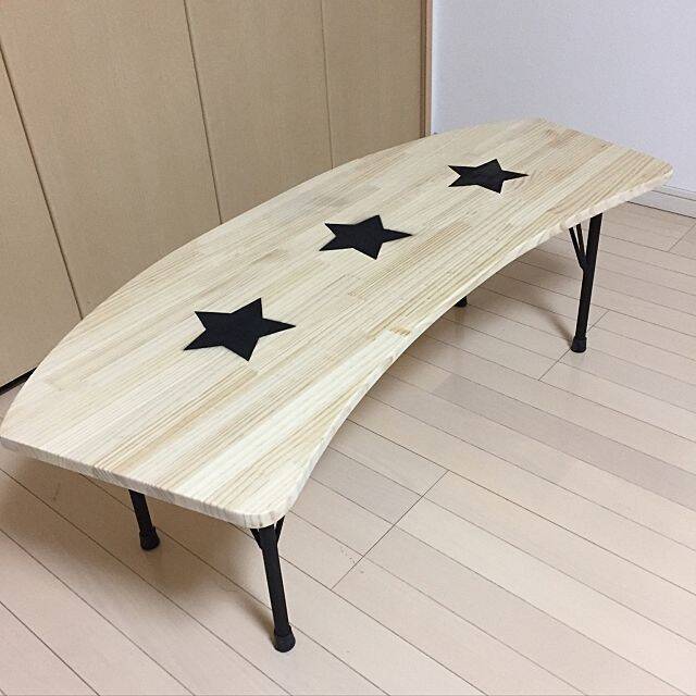 少し湾曲した変形型のベンチ。こちらは、ダイニングテーブルに対応させて作られたのだそうです。既存のアイテムに合わせることができるのは、DIYのよさですよね。パイン材のナチュラルな座面にアイアンの脚を付けて、クールな印象に仕上げていました。ブラックスターがいいアクセントになっています。