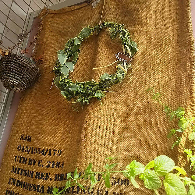 satokoさんはコーヒーの麻袋を、隣室との隔て板のカバーに使用されています。マンションの隔て板は無彩色が多く、なんとなく冷たく感じてグリーンに似合わない場合も。麻袋ならツルニチニチソウのリースやほかのグリーンにも似合うので、GOODアイデアですね♪