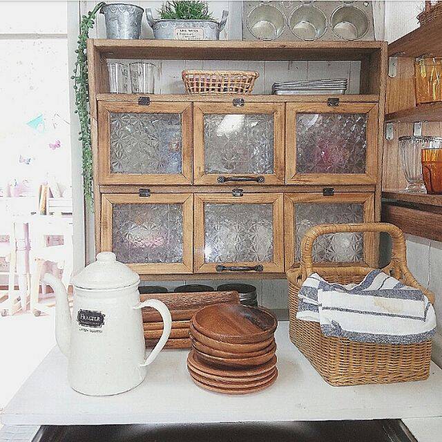Rieさんはキッチンカウンター上のスペースを利用して、棚をDIYされたそうです。フォトフレームで作った扉が見た目もかわいく、目隠しにもなっていていいですね。上の看板と組み合わせると、まるでお店のようです♪