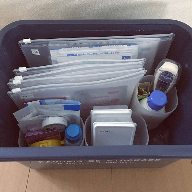 絆創膏やマスクなど細かいものを分けてしまっておくには、無印良品のEVAケースはとても便利です。ファスナー付きでホコリを防げますし、半透明で程よく中身が見えるところも使いやすいですよ。