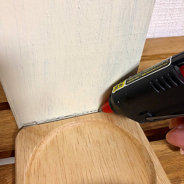 グルーガンは、多めに塗布する方が付きが良いです。コースターと背板の接着は、側面だけでなく裏と表(上)から隙間を埋めるようにすると、より丈夫な仕上がりになります。執筆:RoomClip mag 編集部