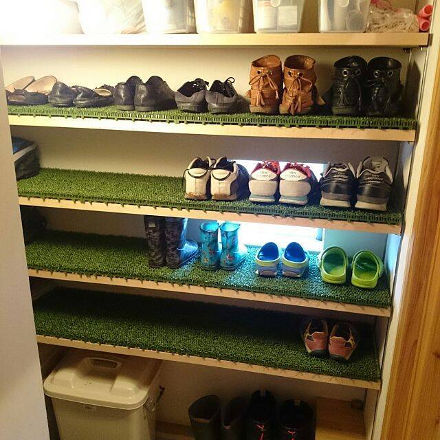 砂埃などが溜まりやすい、下駄箱。お掃除を楽にするため、専用の汚れ防止シートを敷く方も珍しくありません。ところがmachiさんは、専用のシートではなく、なんと人工芝を活用されています。スポーティーでおしゃれですね。お掃除も、人工芝をはたくだけで良さそうです。