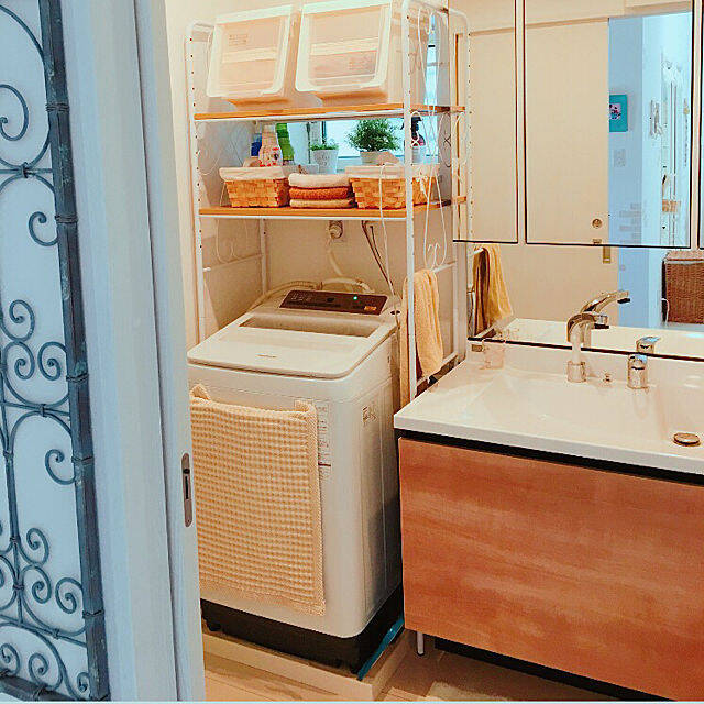 yuka.homeさんは洗濯機の側面に付けるタイプの、コンパクトなラックを利用されています。ナチュラルな木目とホワイトの組み合わせがいいですね。ピンチやネットは白いかごに入れていて使いやすそうです!