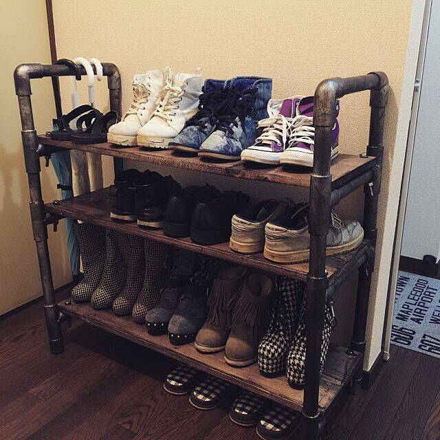 カットした塩ビパイプを両脇に置きボルトで留め、間に板をはって玄関の下駄箱を作ったという実例がこちらです。塩ビパイプを鉄のように見せるため、黒→シルバー→茶色→黒 の順で色を重ねたそうですよ。丁寧なこだわりを感じますね。