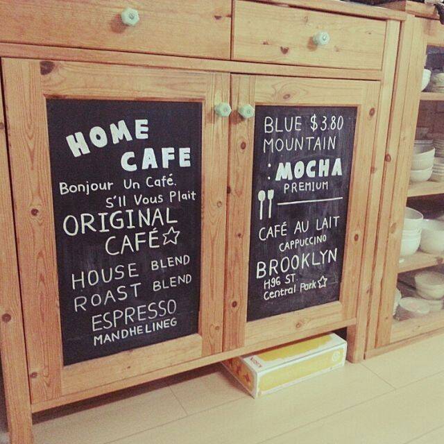 MAYUKOさんはキッチンの食器棚に黒板シートを貼り、白いペンで手書き文字を入れています。コーヒーの名前や値段などを書くと、カフェのメニューボードのようでおしゃれですね!