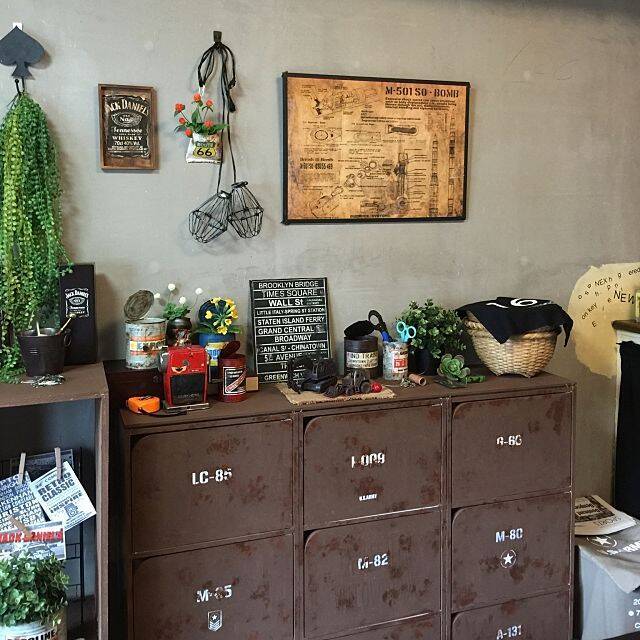 扉つきのカラーボックスを、ペンキで色を変えてから錆び塗装をされています。見た目にもカラーボックスとは思えないほど、クオリティーの高いアレンジですね。鉄のような質感の色に、扉に入ったステンシルがアクセントになって、インダストリアルな雰囲気をプラスしています。
