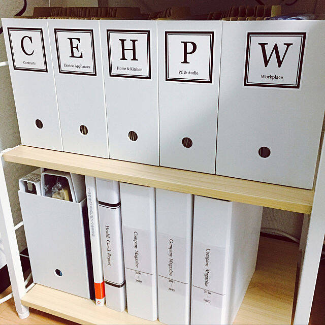 書類収納のファイルボックスに、自作のラベルを貼っているlie_siaolongさんです。それぞれ内容の頭文字を大きくデザインして、目に付きやすくしてあります。シンプルでキチンとした雰囲気もあって、どんなお部屋にもなじみやすそうです。