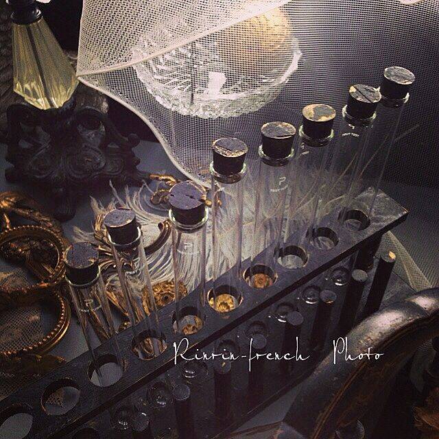 Rinrinfrenchさんの試験管立ては、ひと味違った装いです。炭のようにマットなブラック...... コルク栓にもペイントを施し、理科系アイテムの枠を超え、フレンチシックです♪ バスルームのコンソールを飾る、異国情緒豊かなインテリアに仕上がっています。