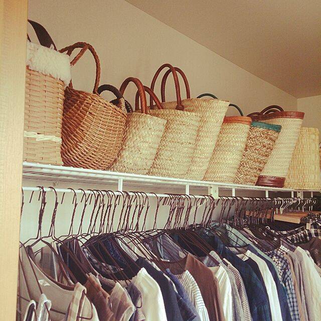 クローゼットは、すべてダイソーの茶色のハンガーで統一しているmojyuさん。高さや幅もそろうので、洋服選びがスムーズになりそう。落ち着いた色味も、ナチュラルなクローゼットに馴染みます。10本で100円なので、気軽に買いそろえられそうです。