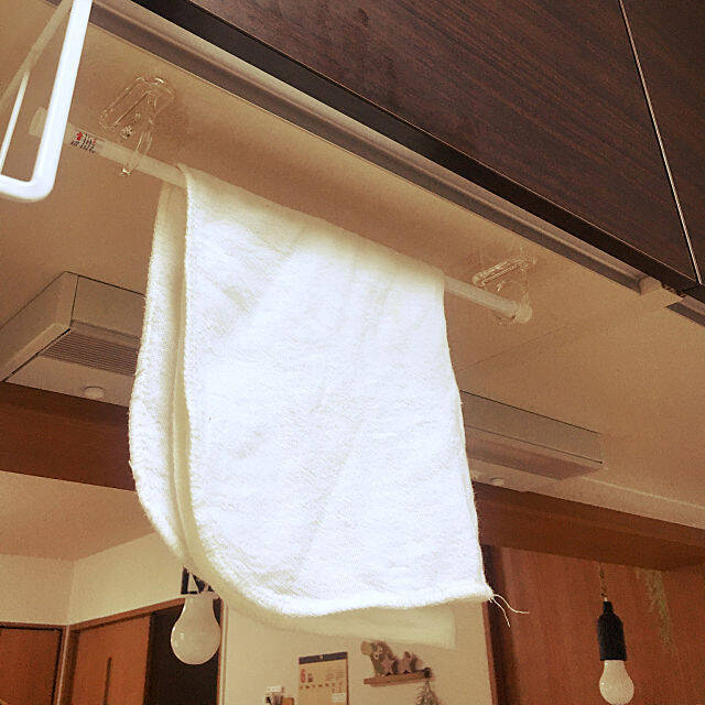 セリアの「貼ってはがせるフィルムフック」には、フックとリングフックがあります。ukkeyさんはキッチンの吊戸棚の下に、リングフックを2個設置。つっぱり棒を通してふきん掛けに使っています。