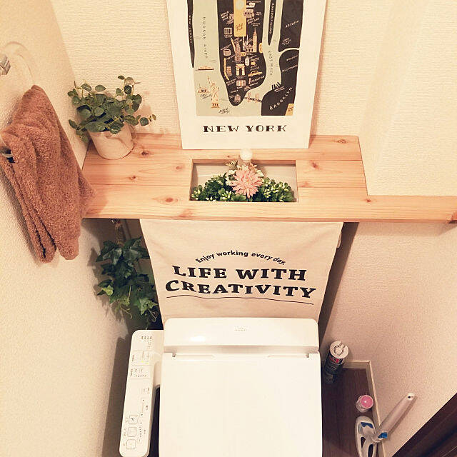 Micさんは、梁のあるトイレをタンクレス風にDIY。タンク上に杉板で天板を作り、タンク隠しはカーテンを使い、サイドはフェイクグリーンをあしらっています。手洗いタンクのリース風の花やアートパネルでセンスアップさせ、GOODアイデアなDIYです。