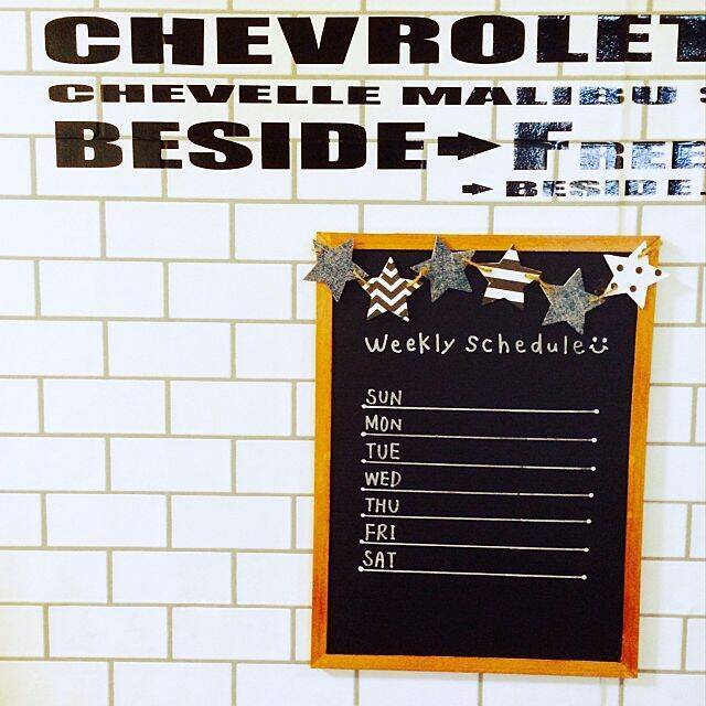 まるでカフェのメニューボードのようで、飾っているだけで絵になります。折り紙とデニムシートでデコレーションされた、星のガーランドがいいアクセントに。すっきりとコンパクトなサイズで、飾る場所を選ばないのもうれしいポイントです。