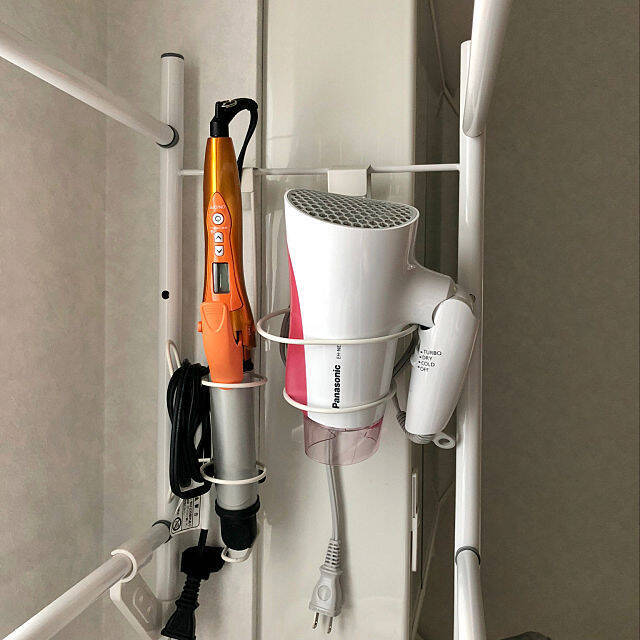 どちらも100均で見つけたという、ドライヤーとヘアアイロンのホルダーです。専用のアイテムはぴったり収まり、すっきり収納できるのがいいですね。ユーザーさんは洗濯機ラックに掛けられているようです。スリムなデザインで、ちょっとしたスペースで使えるのも助かります。