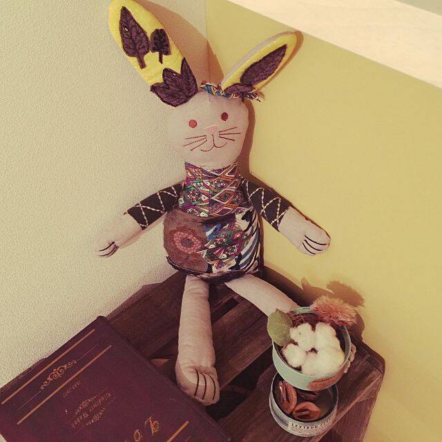 こちらのユーザーさんは、デニムや柄布を使って大きなラグをハンドメイドしています。デザイン性の高いラグは、インテリアをクラスアップしてくれそうですね。さりげなく置かれたぬいぐるみとも、相性抜群です。