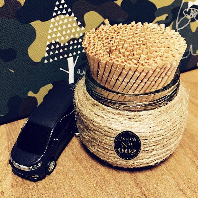 専用の容器のように、つまようじが空き瓶にぴったり収まっています。広口の瓶の形を活かした上手な使い方ですね。麻紐を丁寧に巻くことで、シンプルなガラス瓶が雰囲気のあるナチュラルな容器になっています。