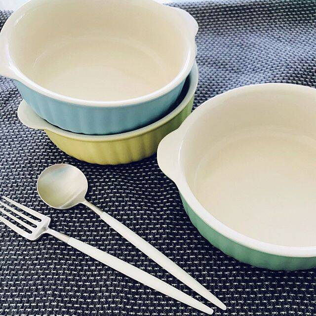 定番のラウンド形のグラタン皿もパステルカラーにするだけで、こんなにキュートな印象になります。イエローにブルー、グリーンとカラフルな食器が並ぶと、食卓が明るくにぎやかになりますね。とろ~りあったかいグラタンを焼いて、家族みんなでわいわい食卓をかこみたくなります。