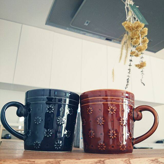 小さな花柄とドットの組み合わせに、こっくりと深みのある色がレトロなセリアのマグカップ。休日の朝や午後のティータイムに使えば、まったりとした気分ですごせそうです。先がくるんとなった持ち手に、飲み口の辺りには2本のラインが入っていたりと、細かいところまでこだわり抜いたデザインになっています。
