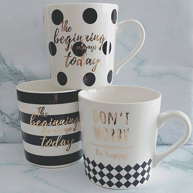 ダイソーのマグカップはドットやボーダー、ハーリキンチェックのモノトーン柄に、ゴールドロゴがアクセントになった色っぽいデザイン。マグカップ片手にファッション雑誌を読んだり、恋愛映画を見たりと優雅なひと時に使えばよりいっそう気分も上がります。