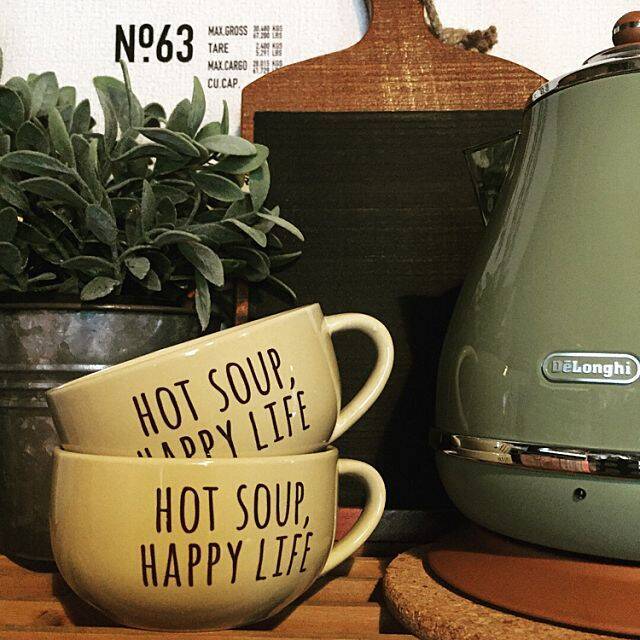 コーンスープやミネストローネなどあったかスープがよく似合う、ぽってりとしたかわいいフォルムのキャンドゥのスープマグは、「HOT SOUP, HAPPY LIFE」の手書き風ロゴ入りです。このマグでスープを飲めば、心も体もほっこり温まり幸せな気分になれそうです。