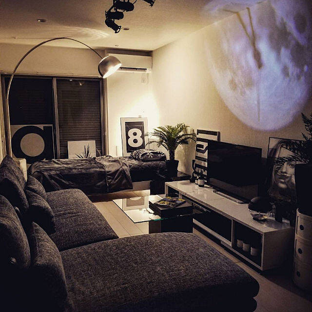 noriさんは、モノトーンでまとめた落ち着いた部屋に間接照明を使って、雰囲気をよくしています。正面の壁に大きく照らされたのは、月面の盤面に時計の針のプロジェクタークロック。アートパネルや観葉植物とのモダンなムードもあいまって、夢見心地の空間になっています。