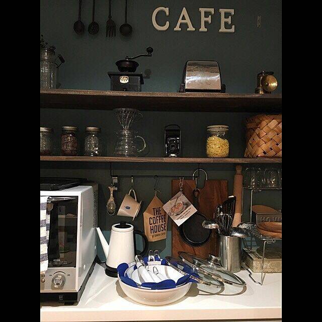 Shinoさんのキッチンはビンテージ感ただようカフェ風の背面ディスプレイ。食器だけでなく、調理器具や家電まで、統一感のあるコーディネートをされていますね。お父様のお部屋にあったというレトロなトースターが、雰囲気づくりに一役買っています。