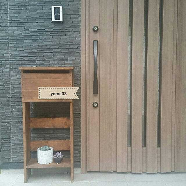 yome03さん宅のポストはご主人作。高級感のあるLIXILの玄関ドアの雰囲気に合わせ、シンプルでしっかりとした作りの木製スタンド置き型ポストです。多肉植物や背の高いグリーンやお花も飾れ、ガーデニングシーンも演出できます。