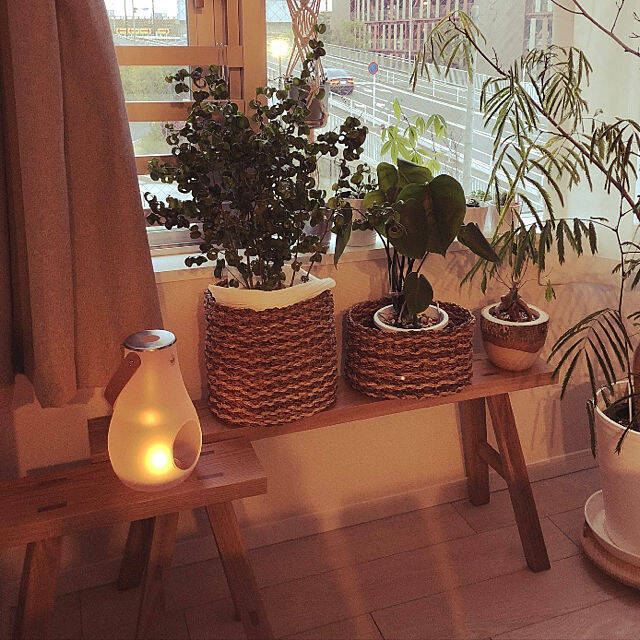 窓際に並んだサイズ違いの無印良品のベンチは、やわらかな灯りを受けて、よりあたたかい表情を見せています。植物たちも居心地のよい場所を与えられて、満足げに映ります。
