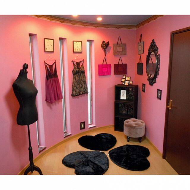 Mitsubachiさんのお部屋はピンク×黒の組み合わせがビビットでとてもキュート。ゴシック調のミラーや壁にディスプレイされたランジェリーが小悪魔っぽい魅力をはなっています。ショップバッグをディスプレイするアイデアは新しいですね!