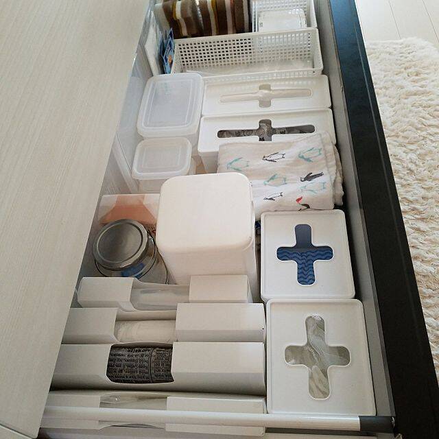 hemukoさんは、シンク下の引き出しの中にプルアウトボックスを置いています。低い位置にある引き出しでも、フタを開けなくていいので上からそのまま取り出しやすいですね。立てる収納も取り入れて、低い位置の収納を使い勝手よく工夫されています。