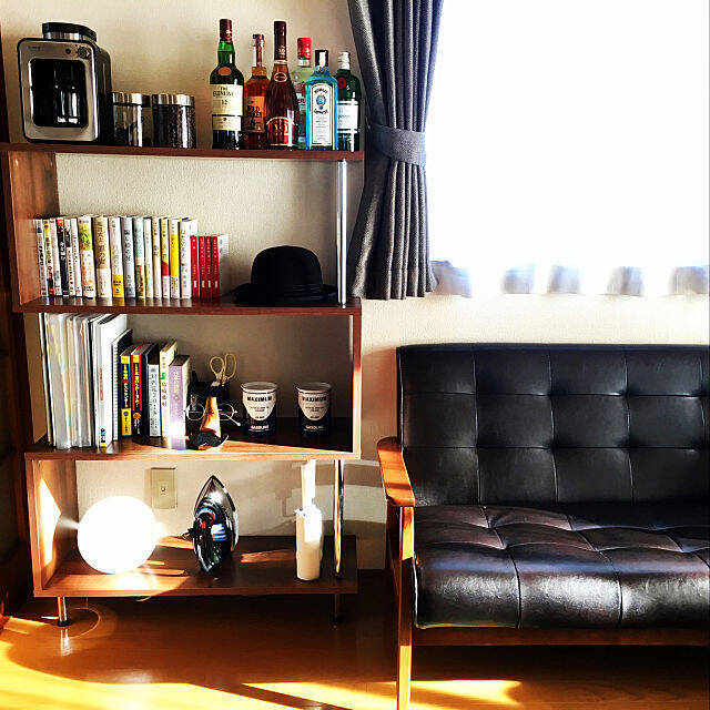 コーヒーメーカー、お酒のボトル、本、帽子などをセンスよく並べディスプレイしたリビングの棚に、スタイリッシュなアイロンが相性抜群です。デザイン性の高いアイロンなら、そのまま立てて置くだけでさまになります。いつも目に見える場所に飾って、モチベーションをアップさせましょう。