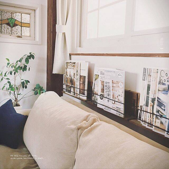 tomoさんは、木材にアイアンバーを取り付けて、本棚をDIYしました。ナチュラルなお部屋に、木とアイアンの組み合わせがマッチして、ゆったりくつろげるカフェスペースのようです。座り心地の良さそうなソファーに座りながら、すぐ手の届く場所に設置されているところも使いやすそうですね。