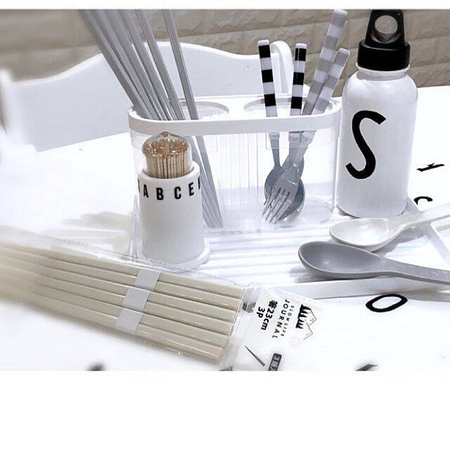 yuriさんご紹介のアイテムは、ホワイト&グレーのお箸、レンゲ、お子さんのカトラリーです。マヨネーズケースを、お箸とカトラリー入れにしてしまう技はさすが!ブラックが差し色のような効果を出し、優しく洗練された雰囲気になっています。
